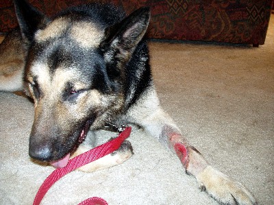 Jeb was not kept safe and was hit by a car on the Fourth of July. A good samaritan took him to the vet, then to the shelter. The shelter kept Jeb as long as possible, and then asked us to step in and save this beautiful boy. Jeb has been progressing and our vet believes he will recover 100%, although its possible that he may have a slight limp for the rest of his life. Jeb is incredibly stoic and plunks down with his head in your lap to get his bandage changed, he seems to enjoy all the TLC he gets and never even winces. Jeb is very tall and big boned. He weighs about 75 pounds now but is very thin, and will probably look good with another 15 to 20 pounds of weight on him.