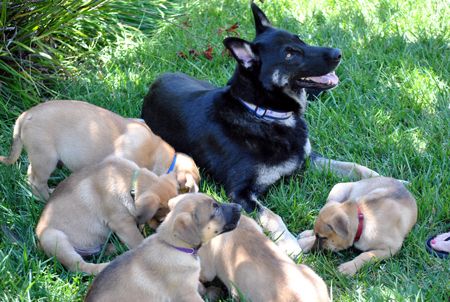 Kelsey, who likely just turned three, came to us with an injured leg that looked as though it had an encounter with a car. This young girl spent about 2 months at the hospital, in the hopes that her leg could be saved. Unfortunately, after two surgeries, it was apparent that the leg was not going to make it and it was in her best interest to have it amputated. While preparing for surgery, it seemed as though Kelsey might be pregnant, even though she wasn't obviously showing. Sure enough, the ultrasound confirmed her five puppies, so they stopped prepping for surgery and she soon delivered a healthy litter of cuties!