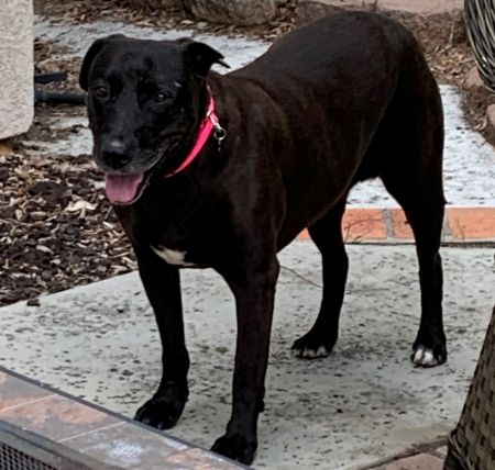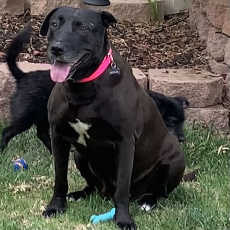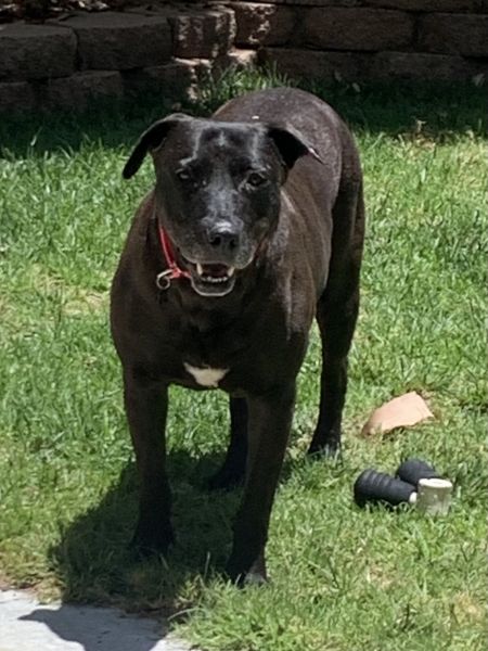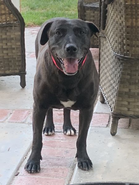 Kelly is a mixed breed dog, probably a combination of Labrador Retriever and American Staffordshire. Kelly's life hasn't always been easy. She was found on the streets and she obviously had a litter of puppies at some time. She is an older girl who will be no bother - she likes to sleep and hang out. She gets along with other dogs and will gently play with dogs her own size. Mostly Kelly likes to watch the birds, sit in the sun, and be mellow.