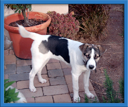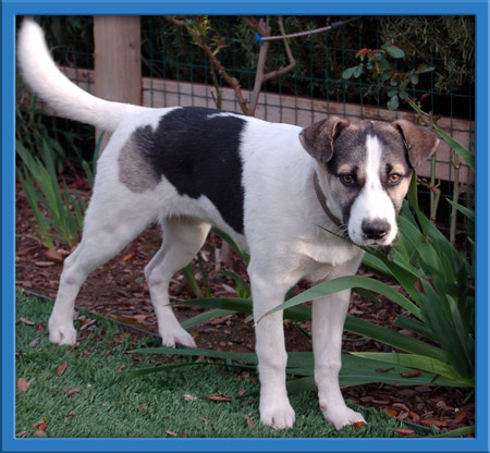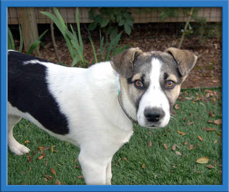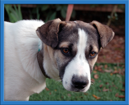 Kimby won't be a large dog - we think she'll probably top out at 45 lbs. Her mom is pretty small and we think she has some smaller terrier in her DNA. Kimby is housebroken and is quickly learning to walk on a leash and experience the big world around her. She is a happy little gal.