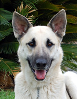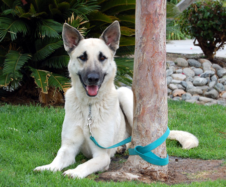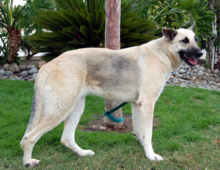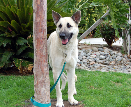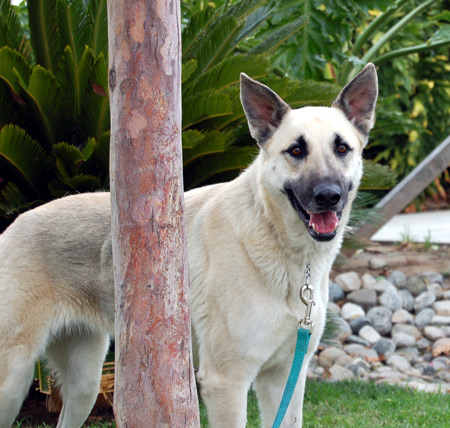 About 2 years old, gorgeous cream and black Lindy found herself homeless at New Year's and stuck in a loud and scary shelter. We made room for her to come join our group and now she is looking for her forever home. Lindy is very mellow and walks beautifully on a leash, even straight out of a kennel run. She is quite tall and imposing for a female - right now she weighs about 75 lbs and is underweight!