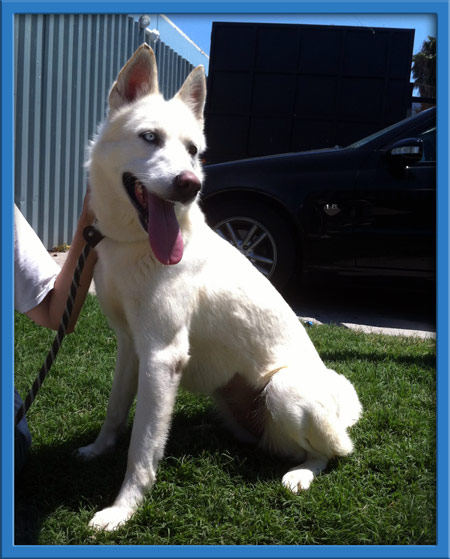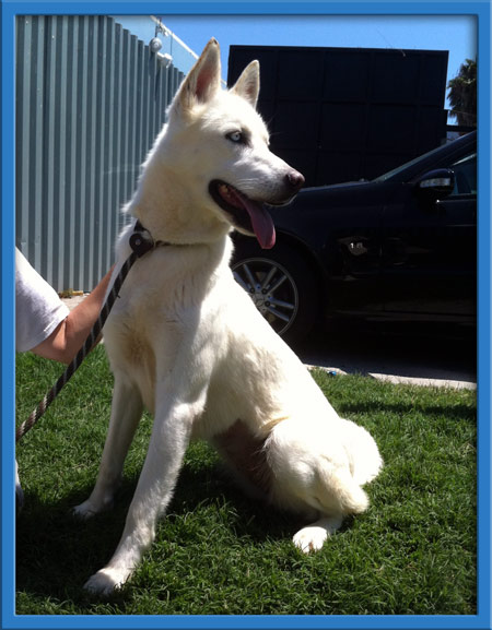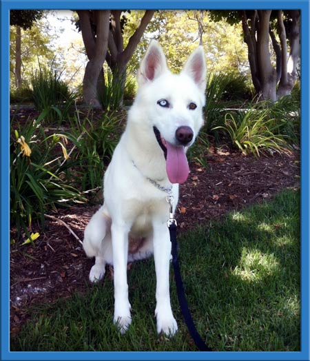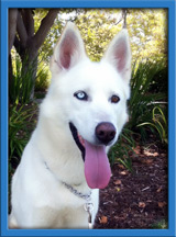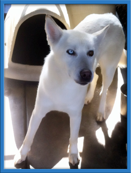 Lindzi was frightened and untrusting when rescued. Now, after seeing that we only want the best for her, she's opened up and learning to enjoy people. With her distinctive brown and blue eyes, Lindzi is as sweet as she is gorgeous -- she loves giving kisses! Lindzi seems to crave being with other dogs and would probably be just fine with small dogs, too (her neighbor in the boarding kennel is a chihuahua and they give each other kisses thru the fence). Lindzi hasn't had much training but she's getting used to walking on a leash and picks up new things quickly. She's very food motivated which makes training a breeze.
