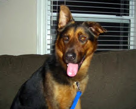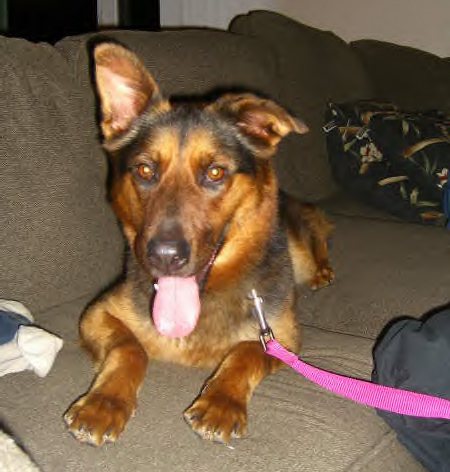 Lola has the cutest little ears - one up and one down! She is such an eye catcher with her gorgeous red and black markings! Her coat really shined after a much needed bath too. She really enjoys her bones, squeaky toys and pig ears. We're still working on "playing ball" with her.