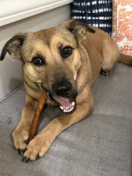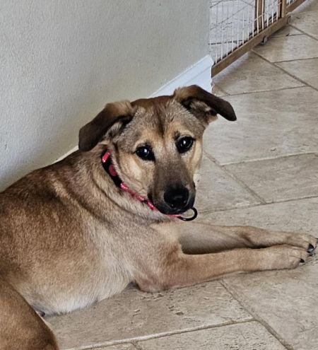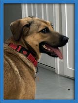 Louise has since come out of her shell and blossomed into a sweet little gal! She is 38 lbs and good with all other animals. She especially likes the fosters' cats and will spend time in the "cat room" with them in the evenings to curl up with them. She prefers men but likes women as well- she is just slower to warm up to women.