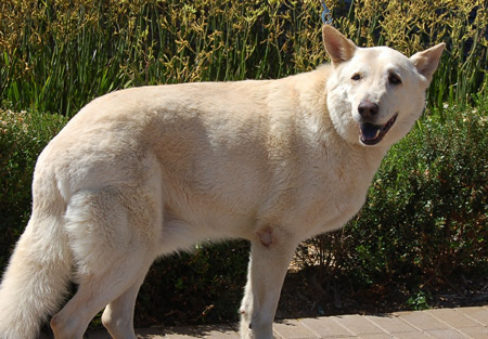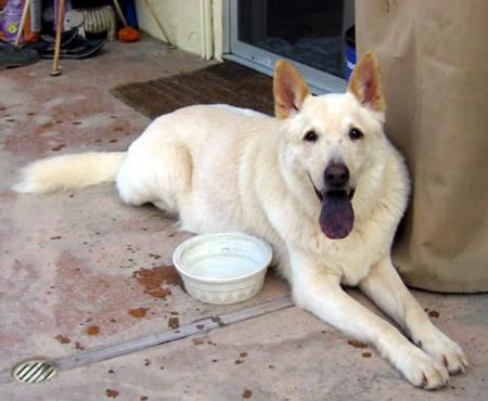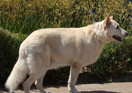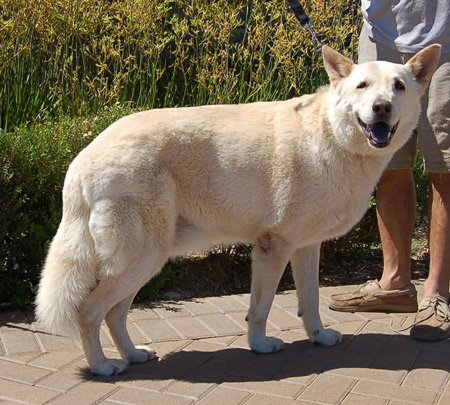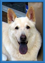 After a little TLC, what we found was a pair of striking beauties. They’re stronger, vigorous and active now, ready to live the life meant for them. Luke is the easygoing one of the pair, and is simply a loveable 90 pound teddy bear. On meeting Luke, you’ll find his smile won’t leave his face as long as you don’t. He lives for petting, and happily emits a variety of little grunts and whines in appreciation. Luke gets along with most every dog, and walks great besides you on the leash. Like his sister, he’s got a Chow purple tongue, and medium coat, but everything else is GSD. No Chow aloofness here, just a gentle giant.