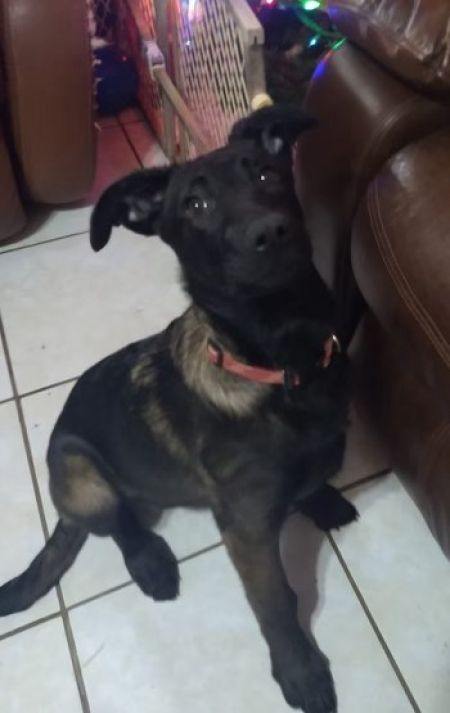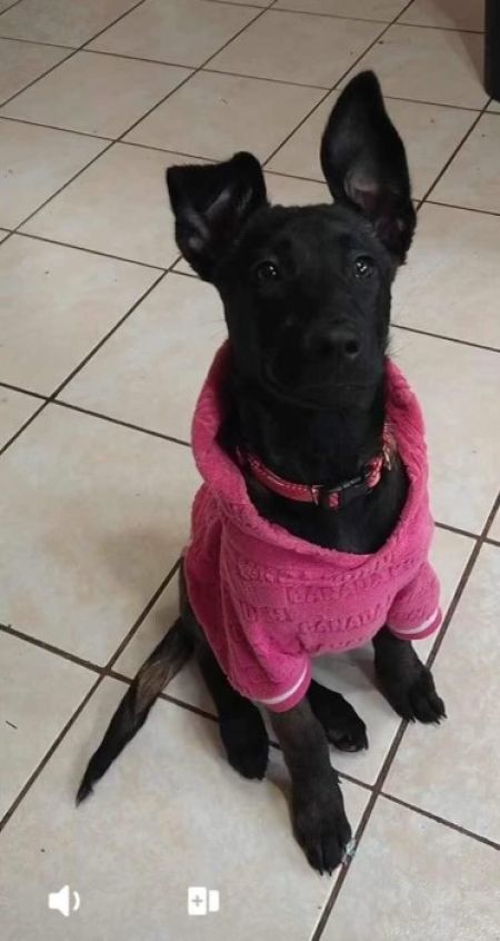 Mamba is about 4 months old and is a GSD mix. Mixed with what, we are not sure, but she is very pretty and loves to play dress up. Her favorite is her pink sweatshirt but she will wear whatever you put on her.