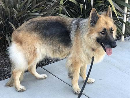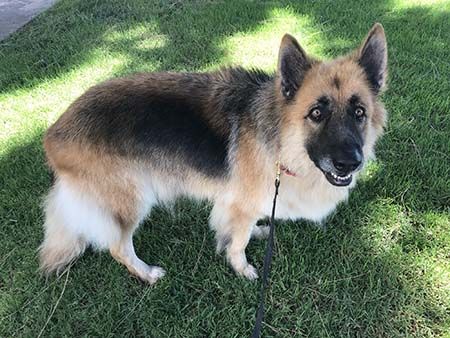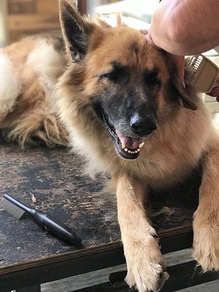 Mia was purchased as a puppy 6-7 years ago (the owners couldn’t be more specific). They said the dogs were for the children and now, with their child leaving for college, they were rehoming Mia. We rescued her and immediately sent her to our vet. Both of her ears were badly infected (they appeared to be chronic infections that had not been treated), she had arthritis, and her coat was a disaster of mats, tangles, fleas, and foxtails. A total sweetheart with a great temperament, she was started on some meds and we began the grooming process. There were 13 sessions of brushing, as well as some cutting, before we attempted to bathe her. The grooming table was where Mia mastered steps for the first time and it became such old hat that you could sometimes find her napping as we worked on her!