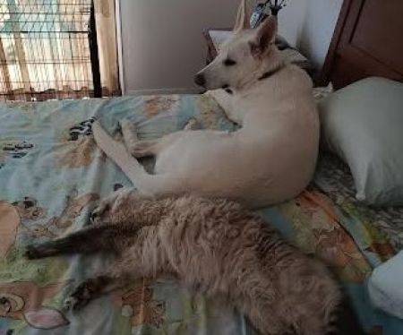 Mufasa currently lives with an English Lab brother (Simba) and a Siamese cat in his foster home. He is also friends with a Cane Corso. They all get along splendidly and the cat and Mufasa sleep on the same bed. Mufasa has been to the dog park and has gotten along with all dogs. He loves people and especially children. He is a big boy growing bigger so if you have small children, you would have to watch them around him as he is happy and active and doesn't know that he is a big puppy.