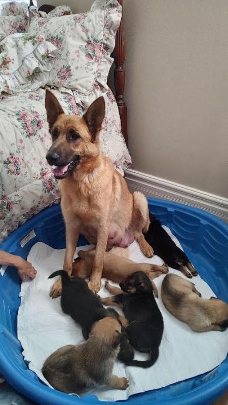 Mom Nella is super sweet and has already been adopted! That is usually the opposite of what happens. The puppies typically are adopted and mom has to find a home for herself afterwards. Now her 6 puppies are ready to go into their forever homes. Some family background: Nella is a cinnamon colored GSD and dad was a GSD with maybe a little something else added in there.