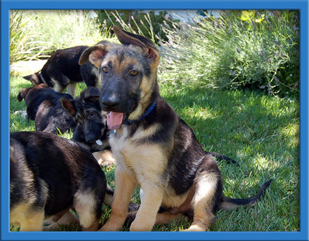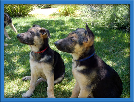 All five puppies know "sit", crate beautifully and are just about potty trained. We have started leash training and they are doing well. They are starting to catch onto "heel" and the "automatic sit". We are working on "stay" and will be teaching them "down". They have learned not to eat your hand when you give them a treat and come running to you when you whistle. The "come" command is excellent when accompanied with the whistle.