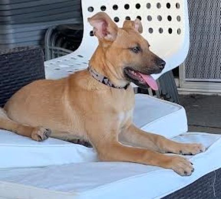 Nikki will not grow any taller but she may fill out some more. She has giant ears that we thought would stand up but mostly they just flop. She is very food motivated, which helps with training. She is fun, fearless, and fast. She is also very alert and an adventurer but she can also be sweet and affectionate too. Nikki goes hard, runs fast, and crashes hard too. Nikki is sharp - she learns new tricks and commands easily and she is adaptable.