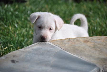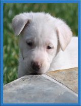 The "O litter" puppies and their mom Oma came to us when the pups were just 2 days old. They were born in a shelter but were quickly whisked away to a foster's home where they spent the first few weeks of their lives with mom. They were weaned and have been potty trained and crate trained. When their foster mom whistles for them to come eat they all go running and you've never seen anything cuter than this puppy stampede towards their food. Three of the pups are white - Olaf, Ophelia, and Opal - and the other four have traditional German Shepherd brown and beige coloring. Oma the mom is a small beige Shepherd with possibly Husky mixed in. We don't know what the dad is.