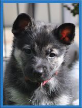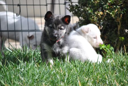 The "O litter" puppies and their mom Oma came to us when the pups were just 2 days old. They were born in a shelter but were quickly whisked away to a foster's home where they spent the first few weeks of their lives with mom. They were weaned and have been potty trained and crate trained. When their foster mom whistles for them to come eat they all go running and you've never seen anything cuter than this puppy stampede towards their food. Three of the pups are white - Olaf, Ophelia, and Opal - and the other four have traditional German Shepherd brown and beige coloring. Oma the mom is a small beige Shepherd with possibly Husky mixed in. We don't know what the dad is.