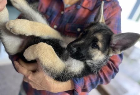She has a love for people and will approach you for attention and a belly rub. We think she will follow her bonded people as they move through life with the devotion typical of a GSD.