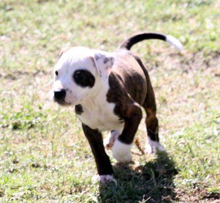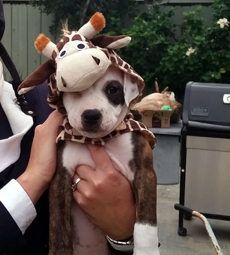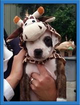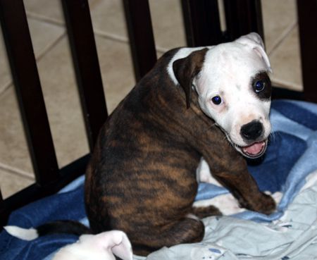 Qbert is a real cuddle bug. He loves people and everyone is a friend. Qbert is a quick learner and is well crate and potty trained. His one brown eye and brindle body make him a dead-ringer for Petey from Little Rascals.