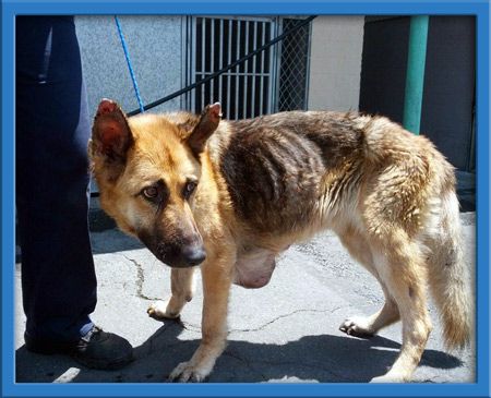 Coastal German Shepherd Rescue saved Queenie on her very last day from a high kill animal shelter. She was emaciated, starving and lethargic. We took her straight to our vet team who diagnosed her with diabetes and mammary tumors. She has been hospitalized for 10 days while the doctors have treated her diabetes and got her stable. She is now ready to leave the hospital and go to a foster home! She does not require much, just a soft bed, good food and two injections a day.