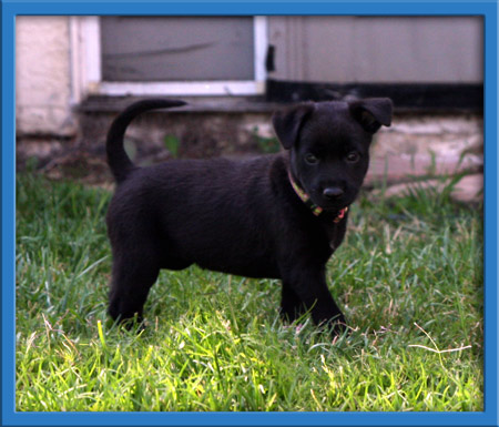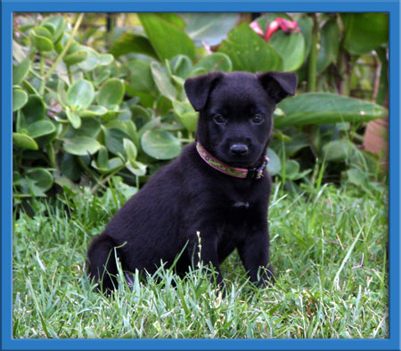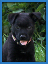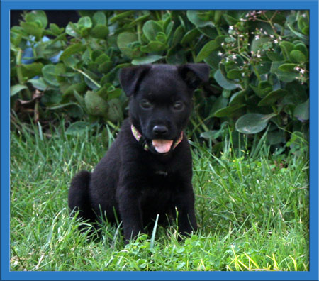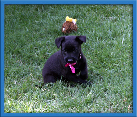 Like the bird, Raven is black and very smart. She learns quickly and loves to discover new things. This happy girl enjoys playing with her toys and cuddling. She loves attention and is very happy to have affection showered on her. Playful and energetic she can make up her own games, playing soccer with a water bottle is one of her favorites. If you are looking for a fun-loving puppy, Raven's the girl for you.