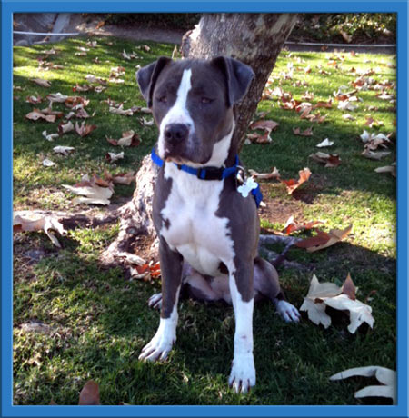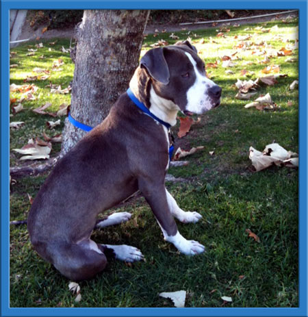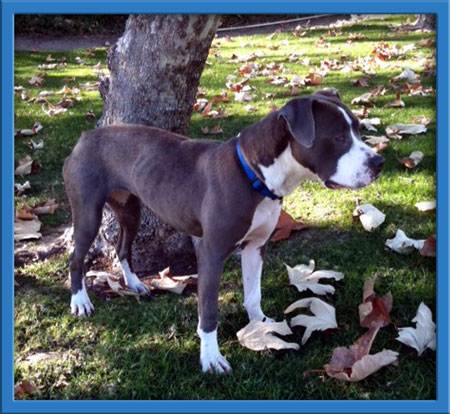 Meet RILEY JENSEN (her middle name!) Sadly, someone nearly starved her to death, most likely trying to make her become aggressive, but this dog doesn't have a mean bone in her body so that didn't work. Thankfully, we were able to rescue her just in the nick of time and rushed her to our Veterinarian for treatment. She initially weighed in at 30 pounds and now weighs a hearty 70 pounds. She has thrived under foster care, has gained weight and looks great!