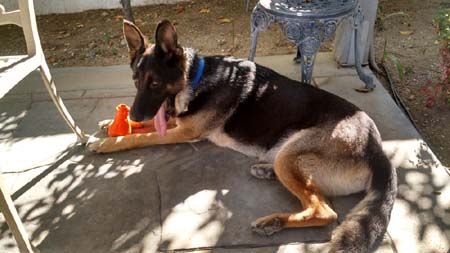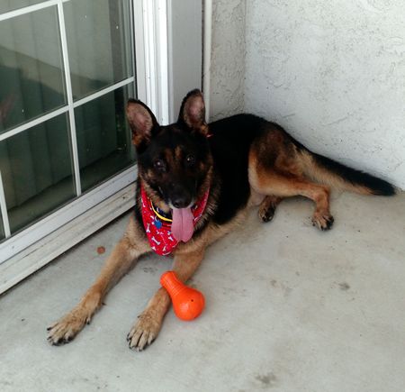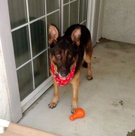 This big boy (90 pounds) LOVES water, and will jump at water jets just for the fun of it, is a great walker, and gets along with other dogs. He had obviously never seen a kong before, but has learned to love it and carry it with him everywhere. Although he's been fine with bigger dogs, he does not like to share his toys, so his foster parents do a great job of maintaining his environment and keeping the peace.