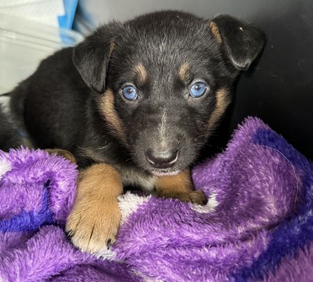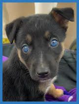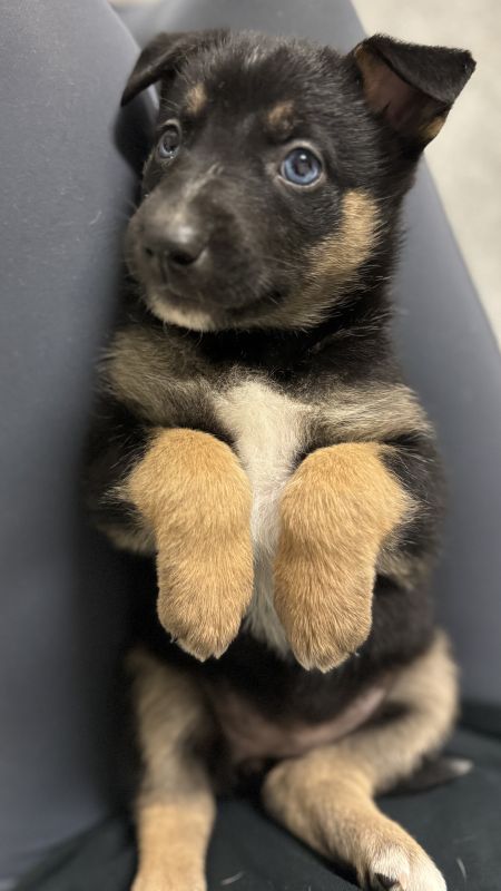 Rooney is the sister and she has piercing blue eyes. Typically eyes this blue are found in Huskies, Weimaraners, Australian Shepherds and Border Collies. It's possible that Rooney is a mix of one of these plus German Shepherd, like her brothers. Rooney is a fun pup who likes to be involved in whatever is going on - wrestling with her brothers, playing with the children, or just hanging out watching the world around her.