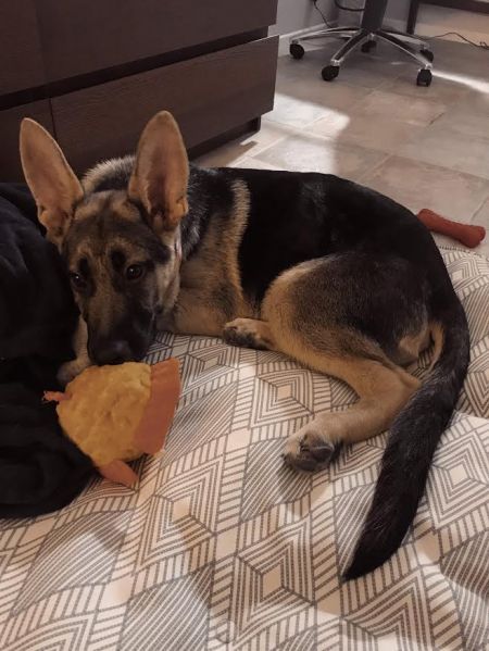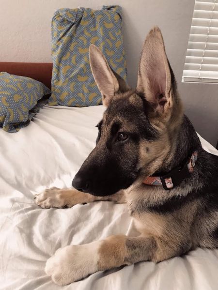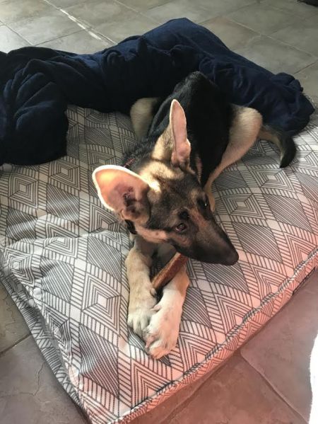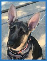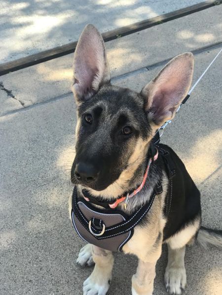 He has grown so much since moving to his foster home and, based on his current size and the size of his paws, Ruger will be a big boy. He has been paper trained and goes to the bathroom on potty pads. He likes to play with toys and his ball. He hasn't been around other dogs yet but is very curious about them. He would do well to be with an older dog that can show him how to play and just general dog behavior. He is very smart - like most GSDs - and has learned basic obedience quickly.