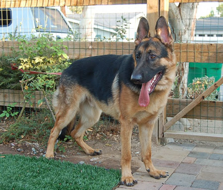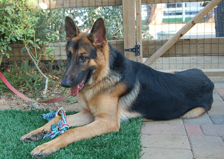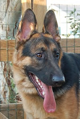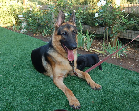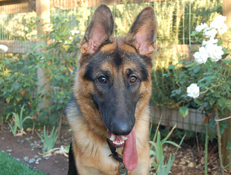 Sam is a goof ball with legs that are all akimbo (you should see him skid around hardwood floors when he is in full play mode!) and a very typical GS teenage boy. Sam loves, loves, loves water - his favorite trick is to 'scuba dive' into the big water pail and then artistically FLIP his head so that water hits everyone (the dog version of Gallagher with water instead of watermelon!)....because Sam likes this trick VERY much, he drinks most of his water outside the house :)