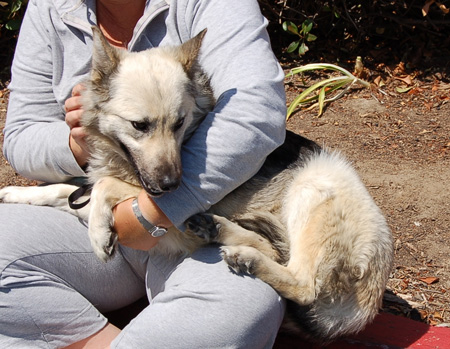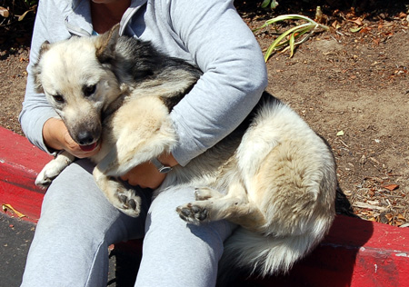 We don't know about her past, but sometimes she behaves as if there's been some abuse or neglect, although she's such a loving girl we just can't believe anyone could treat her like that. She was picked up by a shelter with a dislocated hip, after being hit by a car. Fortunately a shelter volunteer got the word out to the rescues before she was going to be euthanized, and Coastal stepped in to save her. After weeks of waiting in pain, Coastal's vet discovered her other hip was also fractured, and he performed amazing surgery which has alleviated her pain and restored her activity. And she was such a little trooper - she never stopped smiling!