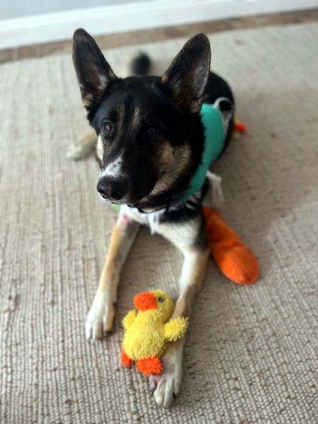 While at the shelter meeting another Shepherd, we were told that there was an urgent dog in the medical ward that we needed to see. Clearly in pain and very uncomfortable, this sweet boy crawled to the front of the cage (cone and all) to get his chin scratched. While reading over his medical record, the notes were from an ER clinic where he had received urgent care from. He had been hit by a car and brought in by some Good Samaritans who had found him. He was in pretty critical condition and the emergency hospital jumped in to save him- even doing a chest tap to get some free air and fluid removed. This definitely saved his life as he had developed a pneumothorax and multiple pulmonary contusions. In addition to the chest injuries, he also sustained injuries to both right and left legs leaving him with open wounds. Scar was moved over to the County Animal Shelter as he did not have any identification on. His condition stabilized while at the shelter, but he needed more care than the shelter could provide. We made arrangements to get Scar out of the shelter and seen by our partner specialists. Scar was quickly diagnosed with a scapular fracture in addition to the injuries we already knew about. Casting, crate rest and pain meds were needed. Scar landed in a wonderful foster home who has nursed him back to health!