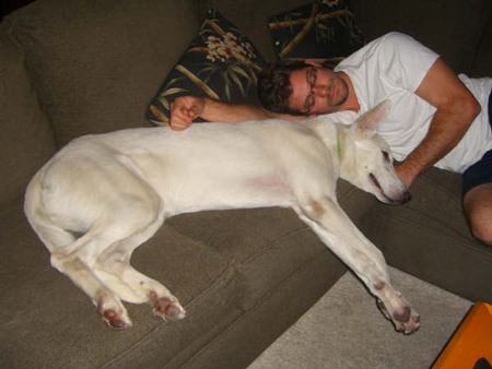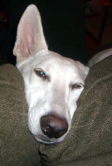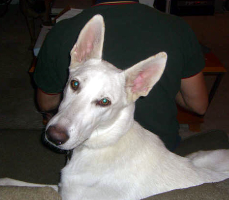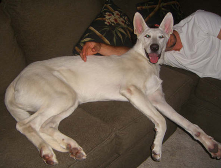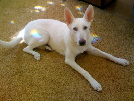 Shiva is a one year old beautifull all white shepherd. She is currently in a foster home with 2 foster parents, 2 mixed breed male cats and 3 large male GSD's. As you can see from her photos, she is a very tall, thin girl.