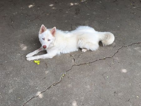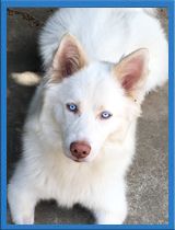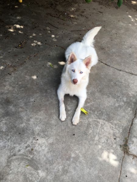 Skye is a beautiful white husky mix with a friendly, open personality. At just under a year old he still has a ton of puppy energy and loves to play. He is housebroken, crate-trained, and knows how to sit and fetch a ball. He absolutely loves all humans, especially kids, and is very gentle in his play. He gets along well with other dogs and with cats. He weighs about 45 pounds and has a very long, soft white coat and pale blue eyes.