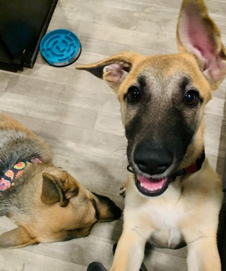 Soleil is super sweet, playful, and is dog friendly. She had her basic vaccinations and tested negative for Parvo. Soleil is a GSD mix and we are not sure what she is mixed with. She is potty trained and uses the doggy door on her own to go out.