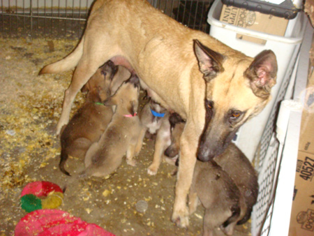 Sona, whose name means gold in Sanskrit and represents her both inside and out, is a pretty blond female with a heart of gold. She and her 7 pups were out in 110 degree weather searching for shade. Sona was doing her best to protect them from the heat. When she was found by animal control she was in critical condition from heat exhaustion. Thank goodness she was picked up when she was. Despite her unfortunate circumstances, she has done an amazing job taking care of her babies- she has 7 robust puppies to show for her efforts. The kind shelter workers transferred her and the babies from a far flung shelter closer to a Coastal Volunteer to get her to safety sooner. While they were loading her for the trip, she was so concerned her little ones would be left behind that she refused to get into the vehicle until the transporters showed her babies to her.