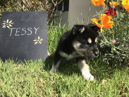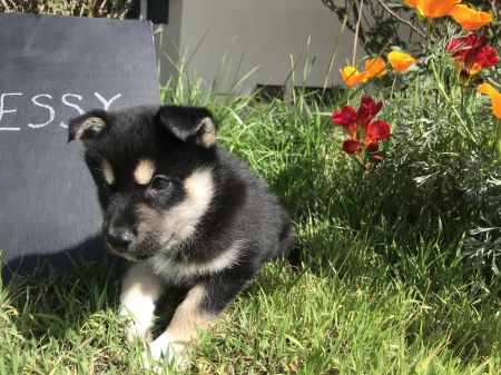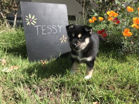 Tessy has the coloring of a traditional GSD unlike her sisters who look more like their dad. The litter's mom appears to be a GSD/Husky/Herding dog mix. The possible dad appears to be a white Husky. The T litter puppies have quite a few Husky traits including being stubborn, very busy, talking and howling.