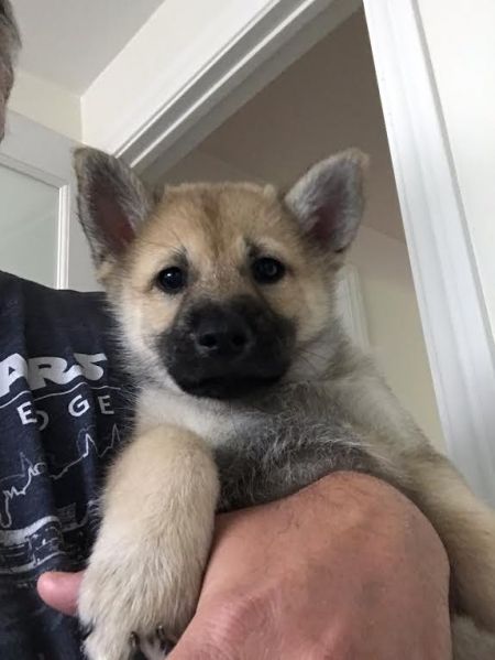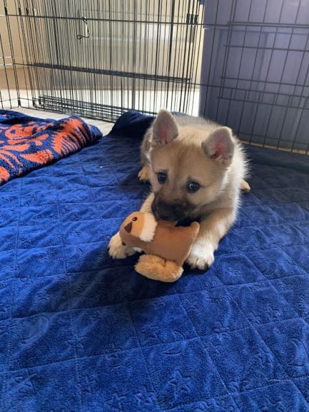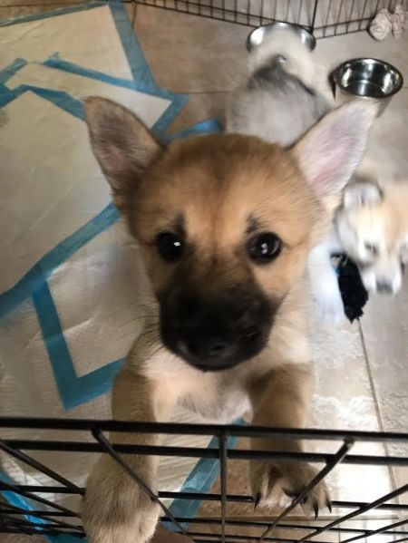 The litter's mom appears to be a GSD/Husky/Herding dog mix. The possible dad appears to be a white Husky. The T litter puppies have quite a few Husky traits including being stubborn, very busy, talking and howling.
