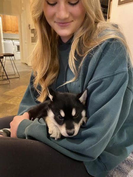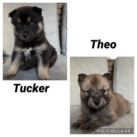 The litter's mom appears to be a GSD/Husky/Herding dog mix. The possible dad appears to be a white Husky. The T litter puppies have quite a few Husky traits including being stubborn, very busy, talking and howling.