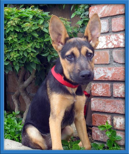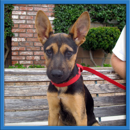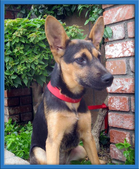 Venus' ears threaten to topple her body over!!! At least the length of her head, they give her a rather comical, bright personality. She loves to sleep curled up on the top of the couch and can hold her own amongst big male shepherds that outweigh her by 100 lbs. She's got one of her big foster brothers wrapped around her paw and she can walk along underneath him if she is feeling threatened by others in the pack!