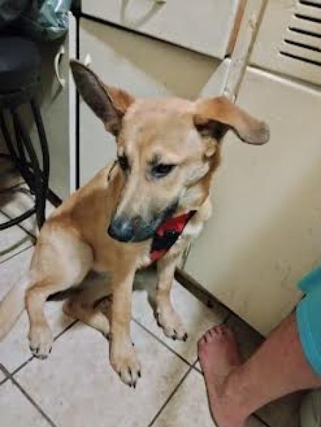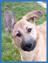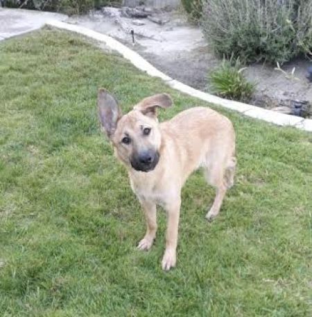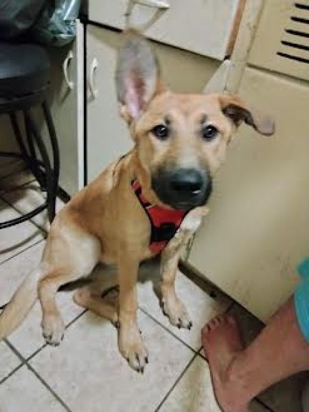 "Waffles" is a pretty, sweet GSD mix puppy with huge floppy ears. We think that Waffles will grow into those ears and will be a good sized girl.