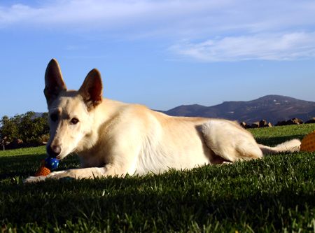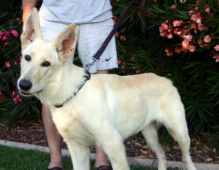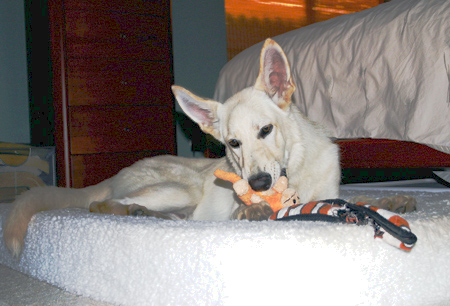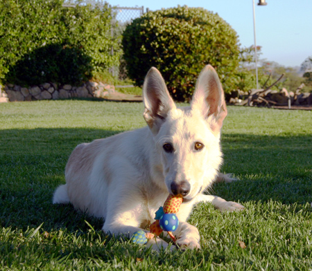 Well, that’s all in the past now . . . Wally is a very well adjusted boy who loves to play, chase, be chased, running around in circles, wrestle, it doesn’t matter so long as he gets to play. He rides in the car like he owns it, he loves to please, eats like a horse, takes a bath like a champ, corrects very easily and last but not least, he’s got a great temperament!