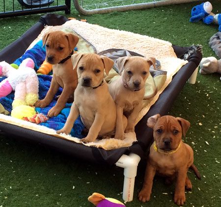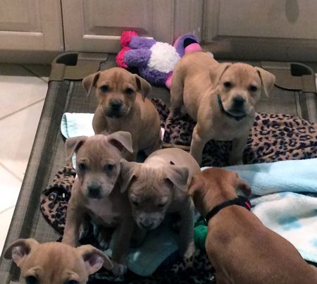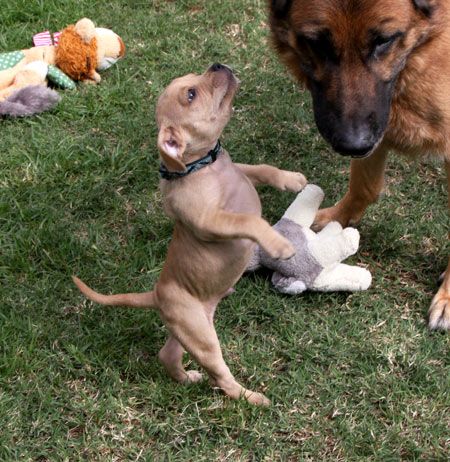 Our Y litter was born to a pair of Pit mix (possibly Boxer) parents that were rescued from the Redlands Shelter. Typical Friday the 13th luck, most of the puppies were delivered by c-section and mom was just to young to step up to the demands of raising a big litter. These adorable puppies have grown up in their foster home with the help of their GSD foster moms, so they are very well socialized with dogs and people.