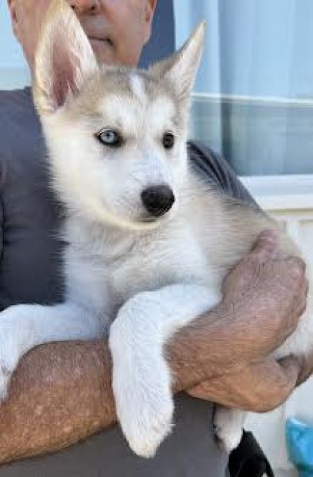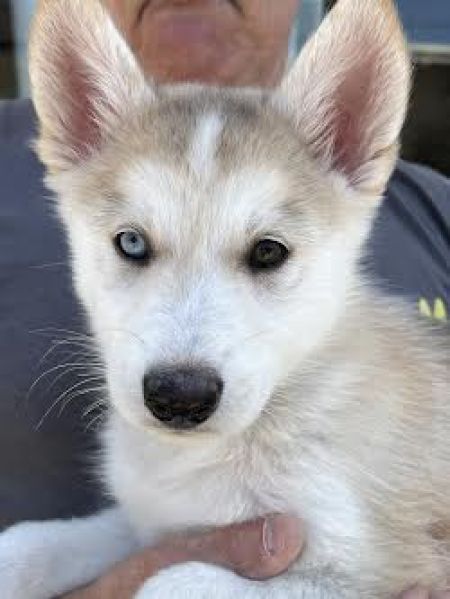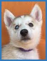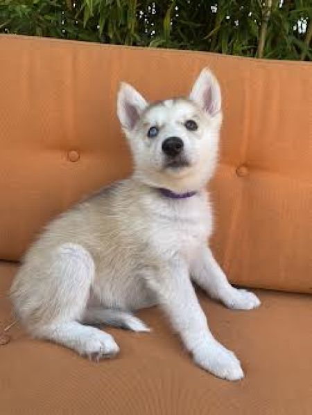 Zaya (purple collar) is part of a trio of strawberry blond colored puppies with one blue eye and one brown eye. She differs from the first two in that her coat is short and smooth. She’s clever, loves cuddles after playtime and is curious to explore new places. She’s very active and would be an enthusiastic companion with children as she loves playing and learning!